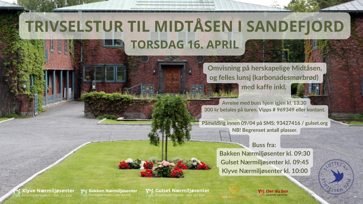 Velkommen til en sosial trivselstur fra Klyve, Bakken og Gulset NMS til herskapelige Villa Midtåsen med omvisning og lunsj.