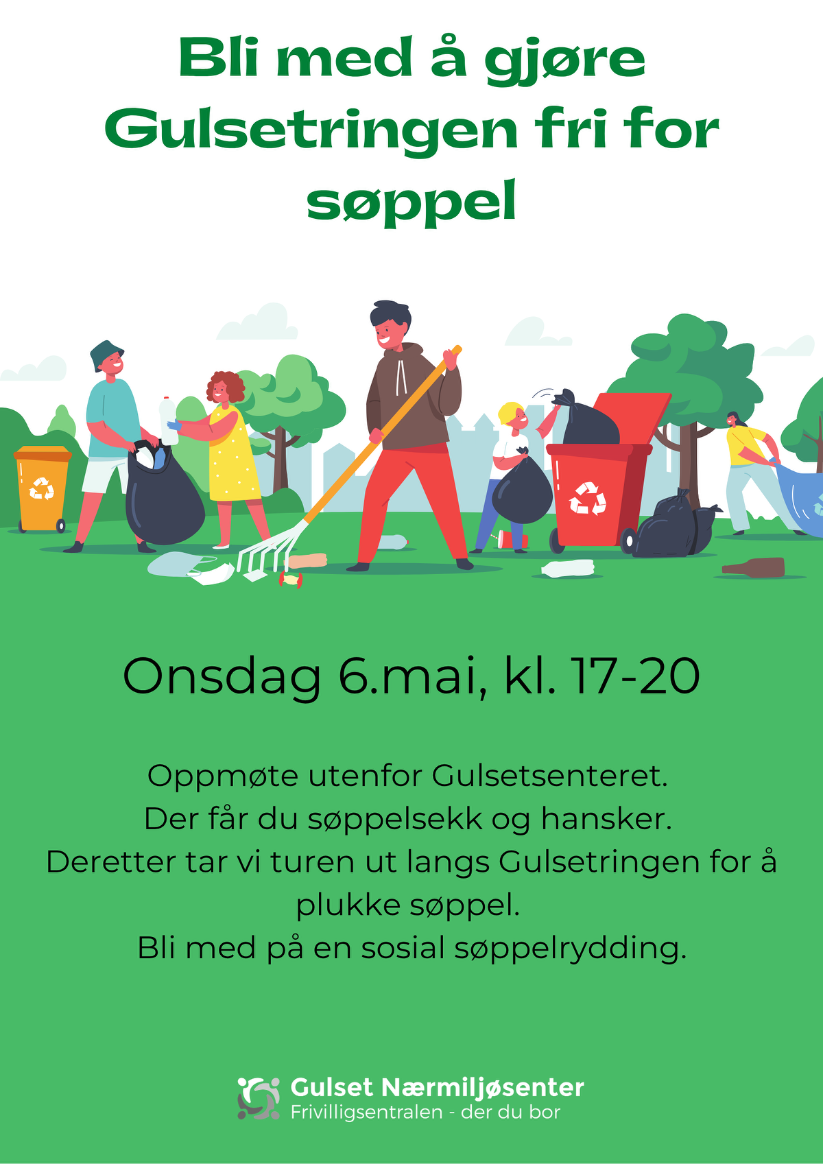 Bli med på en sosial søppelrydding rundt Gulsetringen. Oppmøte utenfor Gulsetsenteret kl. 17. Du får utdelt søppelposer og hansker.