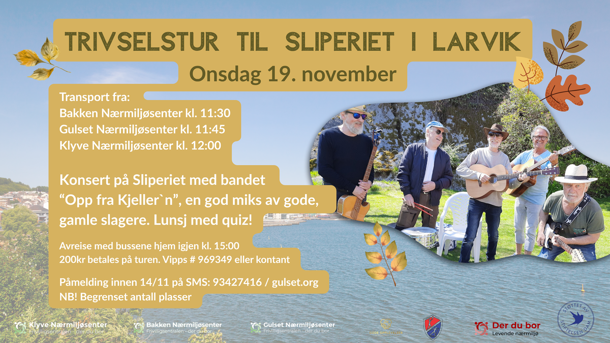 Bli med på en sosial busstur til Larvik, med konsert og lunsj. Turen koster 200kr, og du betaler på turen. Avhenting på Bakken, Gulset og Klyve Nærmiljøsenter. Turen er fulltegnet fra Gulset.